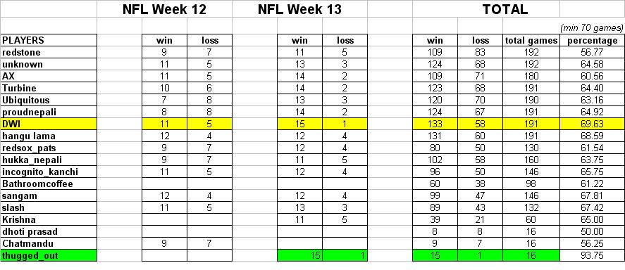 Early PRedcition for the coming weekend: WEEK 13 Sunday, Dec. 5 Arizona at Detroit : Lions (time to get back on the win column) Atlanta at Tampa Bay : Buccainers (Vick will do whatever he is used to doing.......... but in the losing effort) Buffalo at Miami : Bills (see them playing like the playoff contender... wish they were in the NFC West) Carolina at New Orleans : Panthers (I hope them to build on their winning streak) Cincinnati at Baltimore : Ravens (Is J. Lewis healthy to play.. if yes.. see who he is facing again??) Houston at N.Y. Jets : Texans (A HArd hit for the Jets in their search for Playoff spot) Minnesota at Chicago : Vikings (MOSS TIME) New England at Cleveland : Patriots (eat them brownies) San Francisco at St. Louis : Rams (can't find a worse opponent than this) Tennessee at Indianapolis : COlts (Not many teams can stop them. If McNair is 100%, maybe...) Denver at San Diego : Broncos (Won't get a better opportunity than this to take the lead in the Division... playoff implications) Kansas City at Oakland : Chiefs (Impressed with the Raiders victory against the hated Broncos... bUT Chiefs. ..... ) Green Bay at Philadelphia : Packers (They have to win this game in order to keep in pace with the Vikings. It's going to be tough) N.Y. Giants at Washington : Giants (C'mon Manning.... won't be surprised if the Redskins D- takes away the win from the Giants) Pittsburgh at Jacksonville : Jaguars (Playoff hope for Jack Del RIo's team!!! Steelers would have been better off Deuce for this game) Dallas at Seattle : Seahawks (The Division at stake) GO Patriots GO jaiNepal