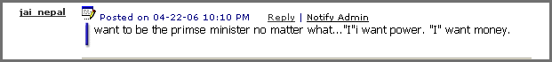 what do u mean by this"No doubt most of his readers or commentors are either from Khaadi Muluk, Malasiya or DV people" Being a nepali respect another nepali, do not compare based on how well they speak or understand english, its not a TOEFL EXAM. BTW i dont see any flavour in your english either. you are just jealous because your comment was not posted?? isn't that this shows how stupid you are. As far as umesh is concerned, i havenot yet seen another nepali blog as popular as Mysansar no matter you login or not.