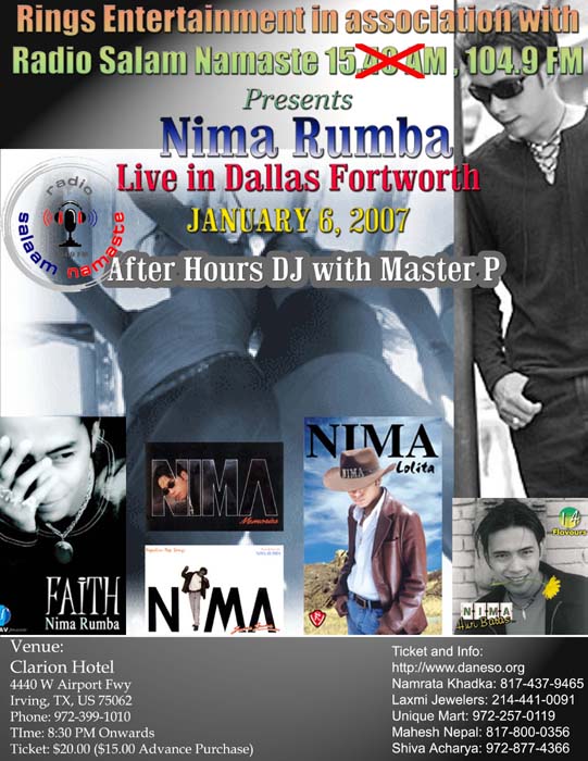 Nima Rumba Live in Dallas Date: January 06, 2007 Venue: Clarian Hotel, Irving, TX Time: 8:30 PM onwards visit http://www.daneso.org for more information