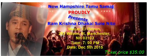 Ram Krishna Dhakal, the most romantic and melodious singer in Nepali music industry is coming to New Hampshire with his live solo performance along with the renown Nepali musicians on Saturday, December 5th 2015. On this occassion, we New Hampshire Tamu Samaj cordially invite you all to attend and enjoy the musical event.